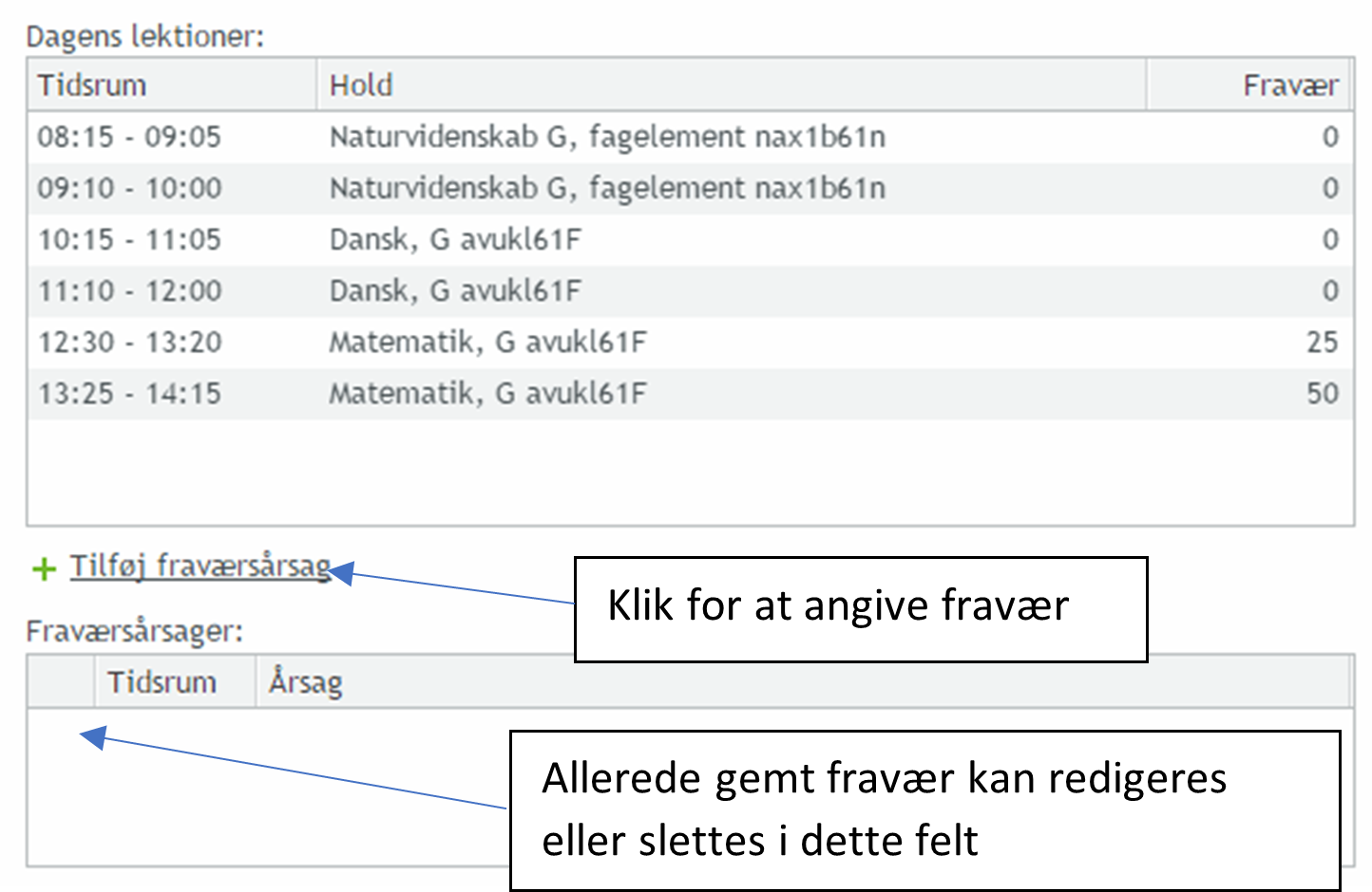 3. Du får nu vist et vindue, der viser dit skema for dagen med angivelse af det fravær, underviseren eventuelt måtte have registreret(billedet nedenfor). Du kan nu angive årsagen til dit fravær ved at vælge ”Tilføj fraværsårsag”: