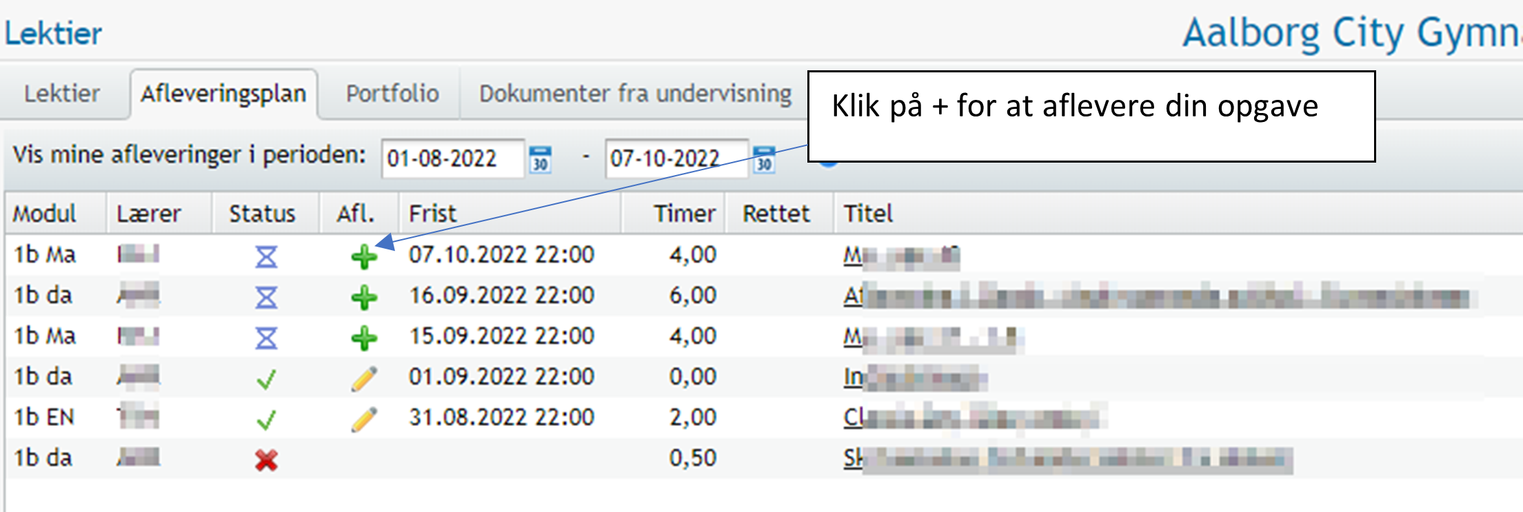 2. Vælg fanen "Afleveringsplan" og klik på + udfor den opgave, som du vil aflevere (se billedet):