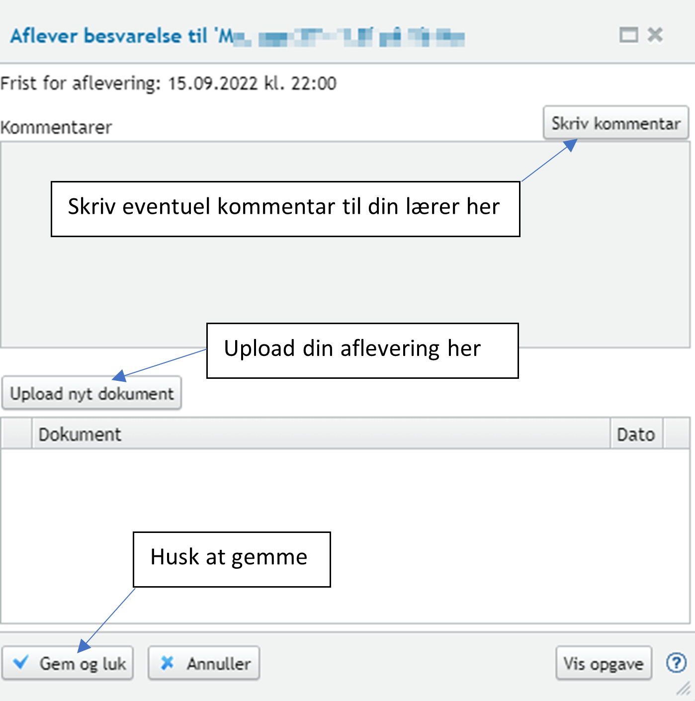 3. På afleveringsskærmbilledet kan du skrive en kommentar og uploade et dokument, som vist på nedenstående billede: