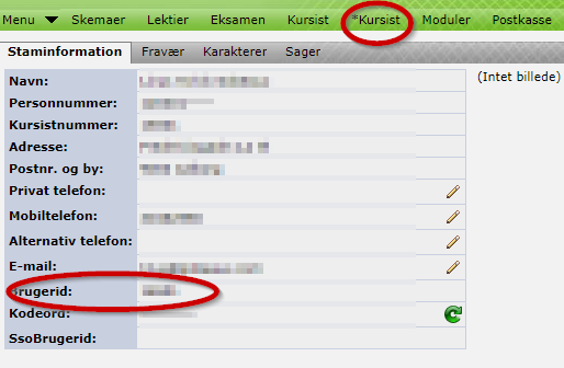 Dit kursistnummer/brugerid benyttes eksempelvis til login på det trådløse netværk. Det kan findes på følgende vis: