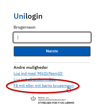 Brugernavn Hvis det er brugernavn, som du ikke kender, så skal du klikke på "Få mit eller mit barns brugernavn" og benytte NemId til at få det vist. |