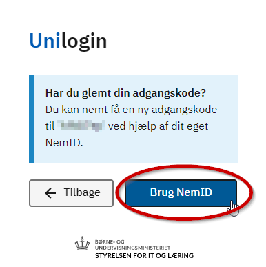 4. Indtast Uni-Login adgangskoden. Kender du ikke denne, så kan du nulstille den med hjælp af "MitID/NemID" (se billedet nedenunder).